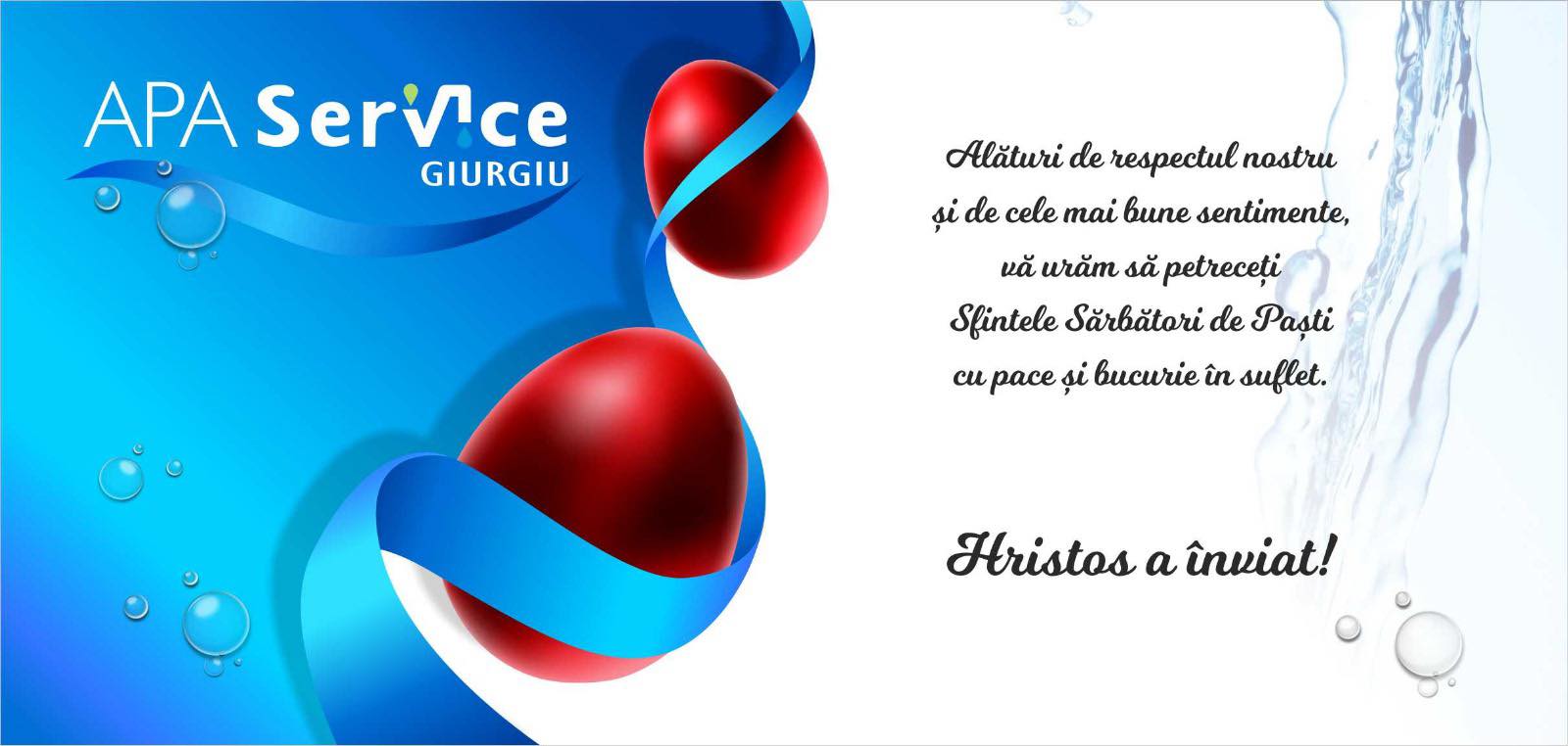 AcasăActualitate Actualitate APA SERVICE GIURGIU vă urează UN PAȘTE FERICIT! By C C 12 aprilie 2026 0 2 FacebookTwitterPinterestWhatsApp Tagsapa servicegiurgiu Acțiune FacebookTwitterPinterestWhatsApp Articolul precedentMesajul de Paști al președintelui Consiliului Județean Giurgiu, Toma PETCUArticolul următorMesajul de Paști al consilierului județean AUR, Dorin CÂNDEA C C Related Articles Actualitate Echipamente de ultimă generație, cu fonduri europene Actualitate Zi mare pentru localitățile Ogrezeni, Malu Spart și Suseni Actualitate Apa Service SA a semnat contractul de lucrari CL3 – Înființarea sistemului de alimentare cu apă și canalizare în aglomerările Cosoba si Săbăreni LĂSAȚI UN MESAJ Renunțați la răspuns Comentariu: Vă rugăm să introduceți comentariul dvs.! Nume:* Introduceți aici numele dvs. Email:* Ați introdus o adresă de e-mail incorectă! Vă rugăm să introduceți adresa dvs. de e-mail aici Website: Salvați numele meu, adresa de e-mail și site-ul web în acest browser pentru data viitoare i comentariu. Cele mai noi articole Actualitate Echipamente de ultimă generație, cu fonduri europene Actualitate Zi mare pentru localitățile Ogrezeni, Malu Spart și Suseni Actualitate Apa Service SA a semnat contractul de lucrari CL3 – Înființarea sistemului de alimentare cu apă și canalizare în aglomerările Cosoba si Săbăreni Actualitate În atenția locuitorilor din comuna Slobozia Actualitate Mesajul de Paști al consilierului județean AUR, Dorin CÂNDEA Încărcați mai multe